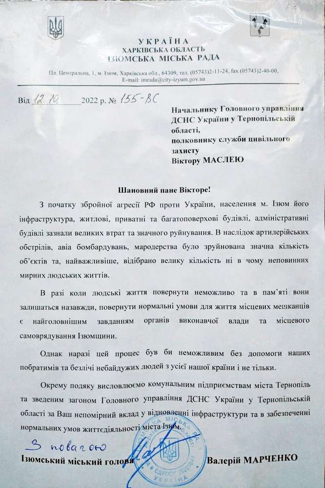 “Дуже приємно чути слова вдячності, які линуть на адресу співробітників ДСНС від громадян, а особливо від обраних ними представників влади. Ізюмський міський голова Валерій Марченко надіслав на адресу Головного управління лист, в якому подякував Тернопільському зведеному загону за непомірний вклад у відновлення інфраструктури міста та налагодження нормальних умов життєдіяльності”, – кажуть в ГУ ДСНС України у Тернопільській області.