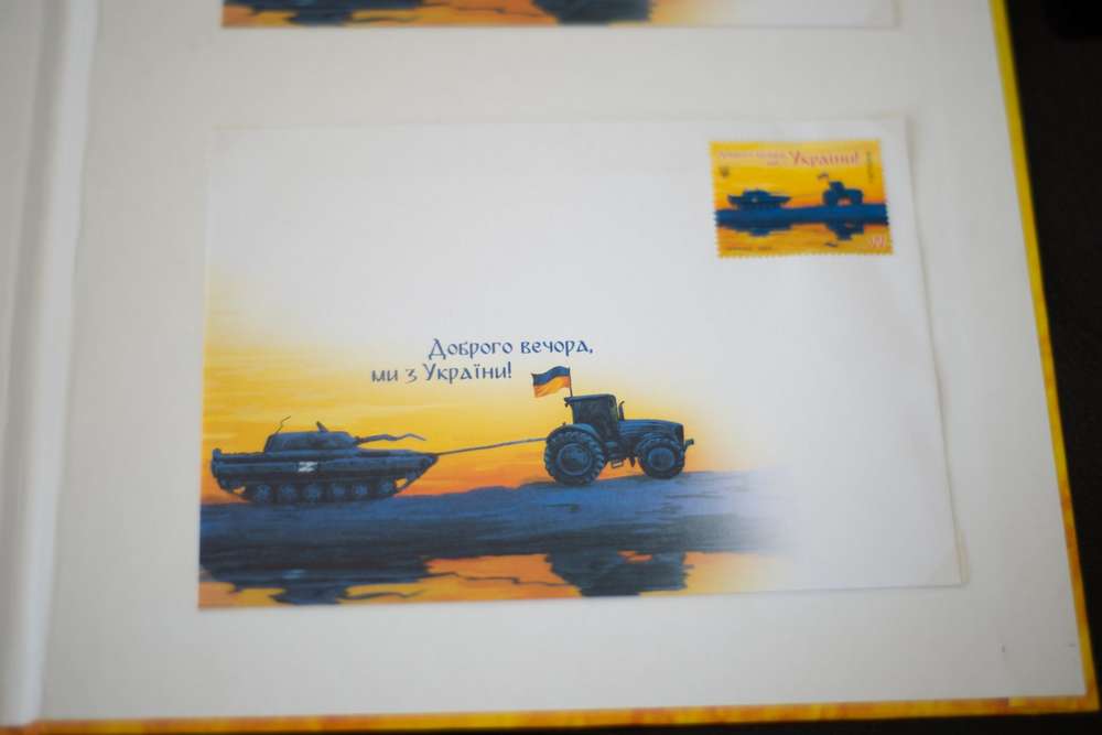 Зображення на марці відтворює реальні події, які мали місце на Миколаївщині: український трактор тягне покинутий російський танк. Автором ескізу стала дизайнер-графік та викладач живопису Анастасія Бондарець.