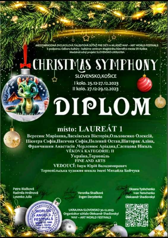 Учні Тернопільської художньої школи імені Михайла Бойчука здобули перемогу у міжнародному мистецькому конкурсі «CHRISTMAS SYMPHONY», який проходив наприкінці грудня  у Польській Республіці. У числі переможців вітаємо Вересюк Маріанну, Лясківську Вікторію, Ольховенко Олексія, Нікотру Софію, Пясечну Софію, Полевого Остапа, Півторак Аліну, Франчишин Анастасію, Черленюк Аріадну, Слєпцову Ніколь та викладача Тернопільської художньої школи імені Михайла Бойчука Юрія Іщука.