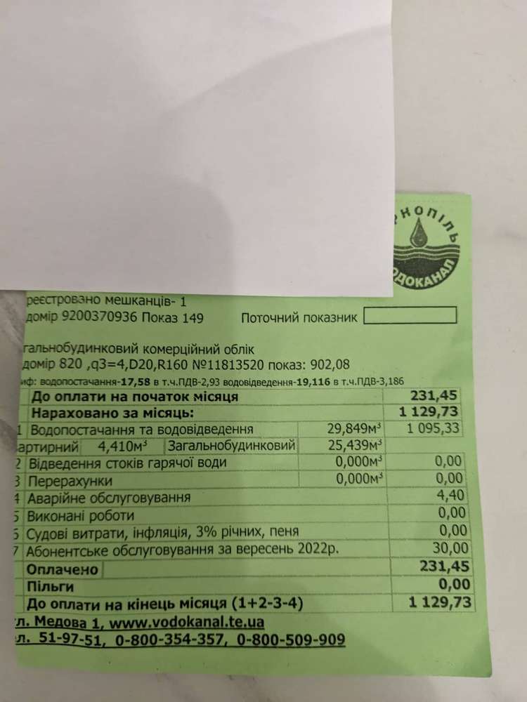 “Отримав рахунок за “надані послуги” КП Тернопільводоканал за жовтень місяць. І був вельми збентежений. В рахунку була сума майже 1130 грн. Тобто 4,41 куб.м по квартирному лічильнику і плюс!!! 25, 44 куб.м по загальнобудинковому. Це при середньому нашому споживанні 5-6 куб.м води в місяць. А в моїх сусідів, взагалі, були суми і по 3500 грн!”, – розповів чоловік.