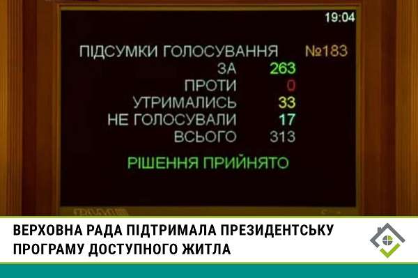 Верховна Рада підтримала важливий законопроєкт, який дозволить невдовзі видати близько 8 тис. іпотечних кредитів на житло та передати 12 тис. квартир у фінансовий лізинг у рамках президентської програми «Велике будівництво». 13 квітня за ініціативу проголосували 263 народних депутати. Про це повідомляє «Укрфінжитло».