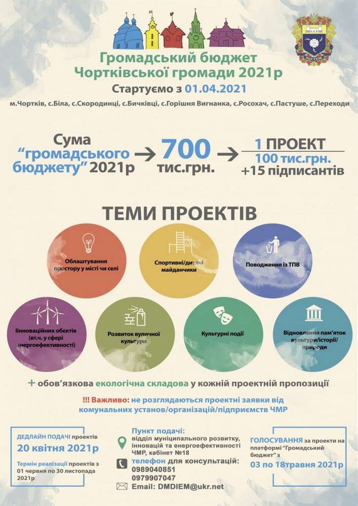 Цьогорічна сума «Громадського бюджету» – 700 тисяч гривень. Максимальна вартість одного проекту – 100 тисяч. Всього буде сім проектів-переможців, три – із сіл громади, чотири – із Чорткова.