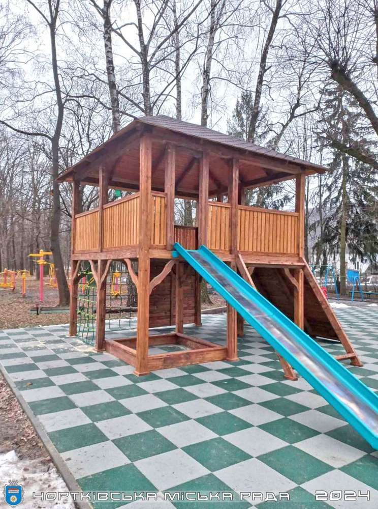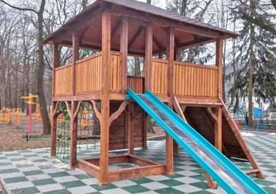 Великий дерев’яний будинок комунальники виготовили повністю самотужки із власних матеріалів. Щоб наповнити будиночок сенсом, додали гірку, два «скеледроми», «павутинку», пісочницю.