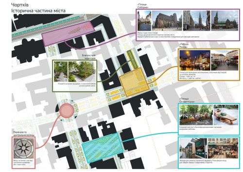 - площа Героїв Євромайдану розглядається як багатофункціональна зона (для щоденних активностей та урочистих подій), облаштований простір для відпочинку перед ЗОШ №2, дитяча зона;