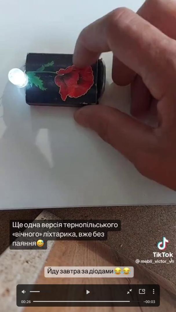 Та тема з “вічною свічкою” стала на стільки популярною, що ТСН вирішила розповісти, як можна зробити такий ліхтарик без паяння. При цьмоу столичні журналісти зауважують, що “вічний” ліхтарик тепер ще називають «тернопільським» на честь міста, де мешкає його винахідник. Світить діод дуже довго і може слугувати аварійним освітленням під час вимкнення електроенергії в українських містах.