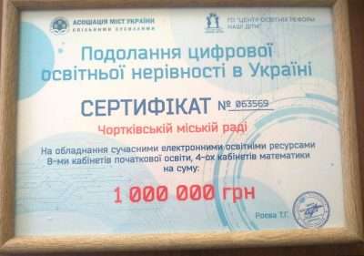 Сертифікат на техніку отримав міський голова Чорткова Володимир Шматько. Цей проект реалізується Асоціацією міст України та громадською організацією «Центр освітніх реформ Наші діти».