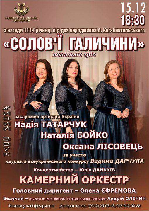 До цієї дати на сцені Тернопільської обласної філармонії виступатиме вокальне тріо «Солов’ї Галичини» (заслужена артистка України Надія Татарчук, Наталія Бойко, Оксана Лісовець). Участь у концерті візьме лауреат всеукраїнського конкурсу Вадим Дарчук. Концертмейстер – Юлія Даньків.