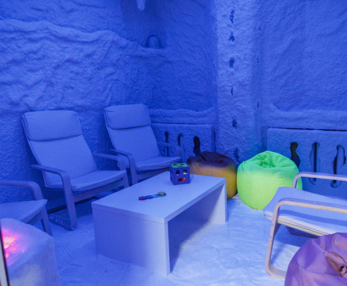 Соляна кімната для маленьких відвідувачів допомагає заспокоїти нервову систему та нормалізувати психоемоційний стан. Вона повністю відповідає по складу соляним печерам. Після відвідувачів кімната провітрюється, включається галокомпресор, яке наповнює іонами повітря, і через 15 хвилин можуть знову кімнату відвідувати діти.