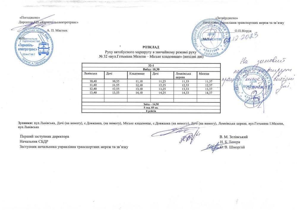 Громадян просять врахувати оновлену інформацію та завчасно планувати свій маршрут. Оновлений розклад руху маршруту №32 у вихідні дні на час зимового періоду додається.