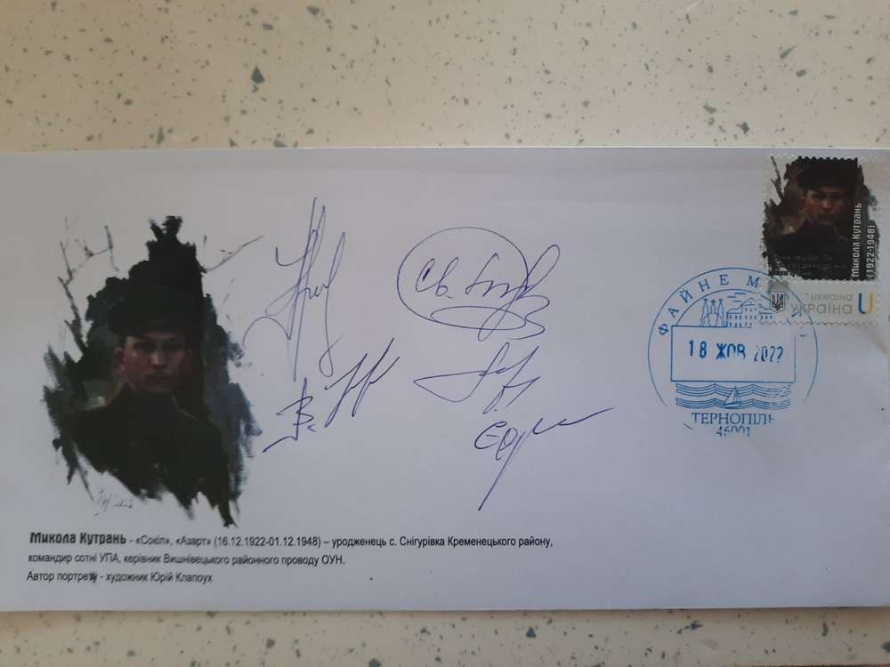 У Тернополі погасили марку з портретом командира сотні УПА Миколи Кутраня. Він був керівником Вишнівецького районного проводу ОУН на псевдо “Сокіл”, “Азарт”. Загинув повстанець у бою з більшовиками 1 грудня 1948 року в селі Великий Кунинець на Кременеччині.