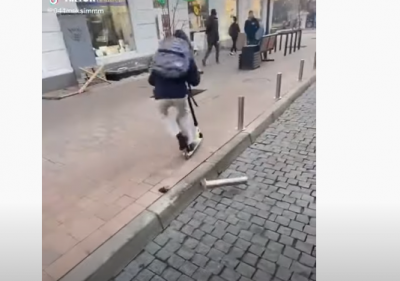 На відео чітко видно, як хлопець виконуючи різноманітні трюки на самокаті, пошкодив обмежувач, який був встановлений на вулиці Чорновола, що в Тернополі.