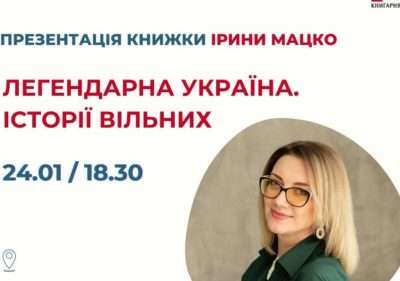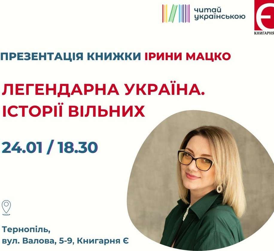 У своїй книжці авторка переповідає історію України — в легендах. З давніх-давен наша земля була щедрою на лицарів, що стояли на боці добра. Трипілля, Київська Русь, Козаччина, часи УПА, сучасна Україна… Кожна епоха має своїх героїв, чиї життя стали легендами. «Легендарна Україна. Історії вільних» — це збірка авторських легенд, натхненних історичними подіями, традиціями, побутом та звичаями прадавніх українців. Місія цієї книжки — зацікавити нове покоління відкривати для себе сторінки рідної історії. Захопливі, звитяжні, іноді трагічні, та попри все — переможні! Про усе це і поговоримо разом з вами 24 січня у нашій книгарні. Модератор: Леся Заморська. Зустрічаємося 24 січня о 18:30 у книгарні «Є» (Тернопіль, вул. Валова 5-9). Вхід вільний. Книжку можна буде придбати під час презентації.