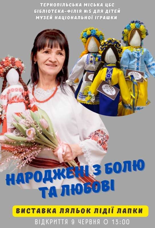 9 червня о 13:00 год. у Тернопільській міській центральній бібліотеці (вул.Руська, 31) та в бібліотеці – філії №5 для дітей (вул. Василя Стуса, 4), при якій функціонує Музей національної іграшки, для тернополян та гостей міста відкриється авторська виставка ляльок Лідії Лапки «Народжені з болю та любові».