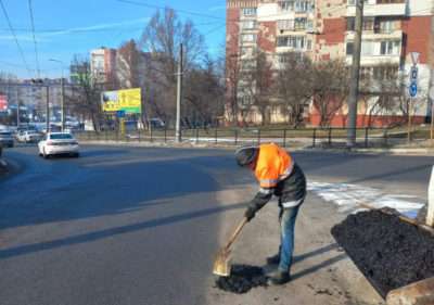Працівники підрядної організації продовжують виконувати роботи з ліквідації аварійних вибоїн на проїзних вулицях міста та проводити роботи з пониження ділянок перед пішохідними переходами.