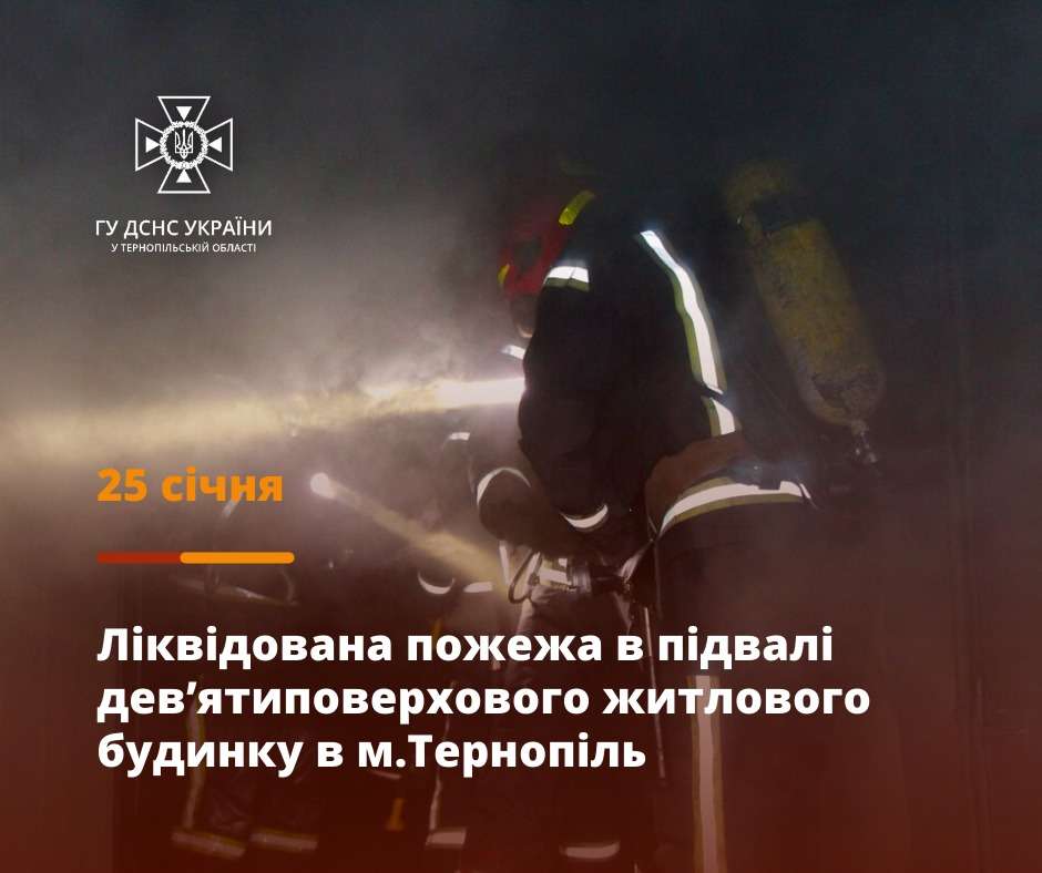 25 січня о 19:56 на номер екстреного виклику «101» надійшло повідомлення про пожежу, що виникла в підвалі дев’ятиповерхового багатоквартирного житлового будинку на вул. Київській, 8 в м. Тернопіль. Повідомили в Головному управлінні ДСНС Тернопільської областію