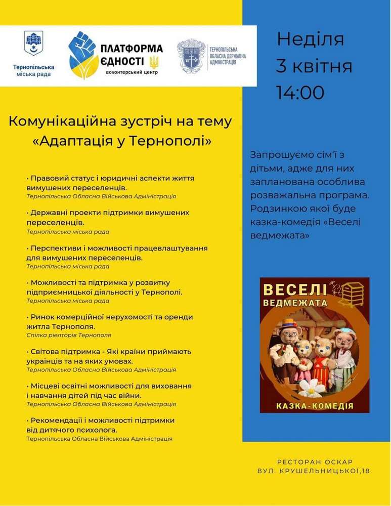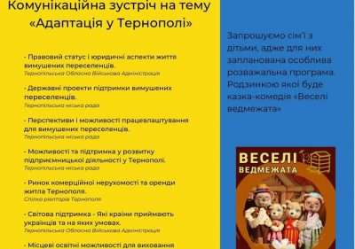 Відповіді на ці та багато інших запитань внутрішньо переміщені особи зможуть отримати від представників військової адміністрації під час комунікаційної зустрічі «Адаптація у Тернополі». Вона відбудеться у неділю, 3 квітня.