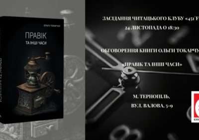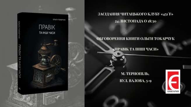Запрошуємо на засідання читацького клубу «451F» та обговорення книги Ольги Токарчук «Правік та інші часи». Зустрічаємося 24 листопада об 18:30 у Книгарні Є, за адресою м.Тернопіль, вул. Валова, 5-9. Правік — це село, розташоване в центрі всесвіту, на межі реальності й міфу, сьогодення і вічності, буденності й чуда.