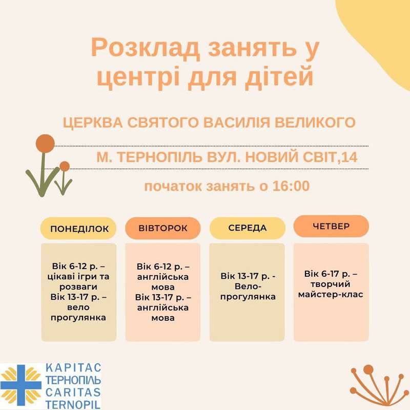 Дітей шкільного віку запрошують до парафіяльного «Карітасу» за адресою: м. Тернопіль, вул. Новий Світ, 14. Контактні особи: п. Вікторія(0967346358), бр. Віталій (0989236987).