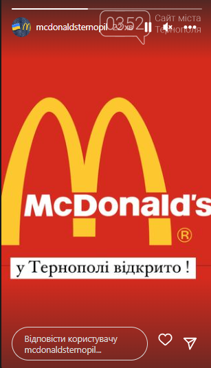 Відсьогодні, у Тернополі відновив роботу заклад харчування McDonald’s. Про це повідомили на Instagram-cторінці “Mcdonaldsternopil”.