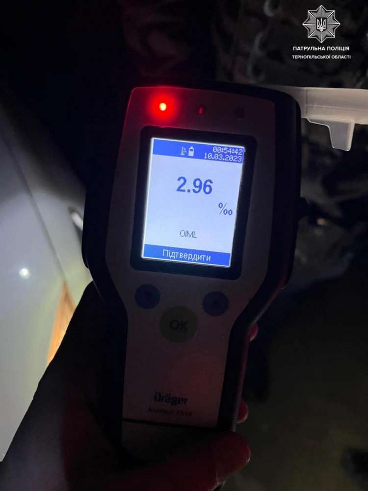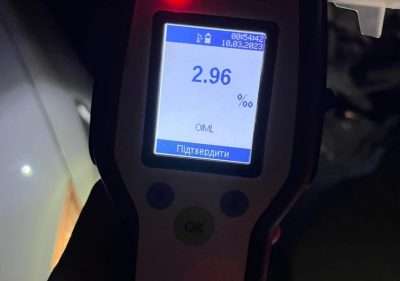 Охоронці порядку запропонували чоловікові пройти огляд на стан сп’яніння на місці зупинки за допомогою алкотесту Драгер, на що останній погодився. Результат огляду виявився позитивним, прилад зафіксував 2,96 проміле алкоголю в крові водія. Окрім того, чоловік не мав права керувати транспортним засобом. Патрульні склали на чоловіка протоколи за ч. 1 ст. 130 (Керування транспортним засобом в стані сп’яніння) та за ч. 5 ст. 126 (Повторне протягом року керування транспортним засобом особою, яка не мала такого права) КУпАП.