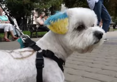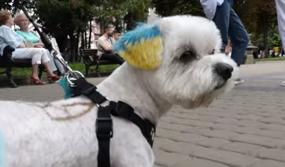 Перефарбувати свого собаку у патріотичні кольори ідея її маленької господині. 7-річна Яринка Сиротюк каже, що це вже не перший досвід перевтілення її собаки. Лише раніше кольори були іншими. Коли настав час Біллі стригти, то не обійшлося без експериментів.