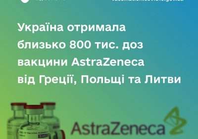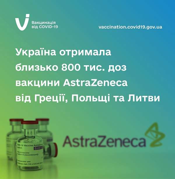 16 серпня 2021 року Україна отримала 100 000 доз вакцини AstraZeneca від уряду Греції, а 18 серпня – 650 400 доз цієї ж вакцини від Польщі та 46 000 доз від Литви як гуманітарну допомогу.