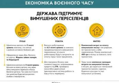 1 – гроші. Держава виплатить кожному переселенцю в Україні мінімальну грошову щомісячну допомогу у розмірі 2 тисячі гривень. Також 3 тисячі гривень будуть виплачені на кожну дитину, яка через війну вимушено переїхала в більш безпечні регіони.