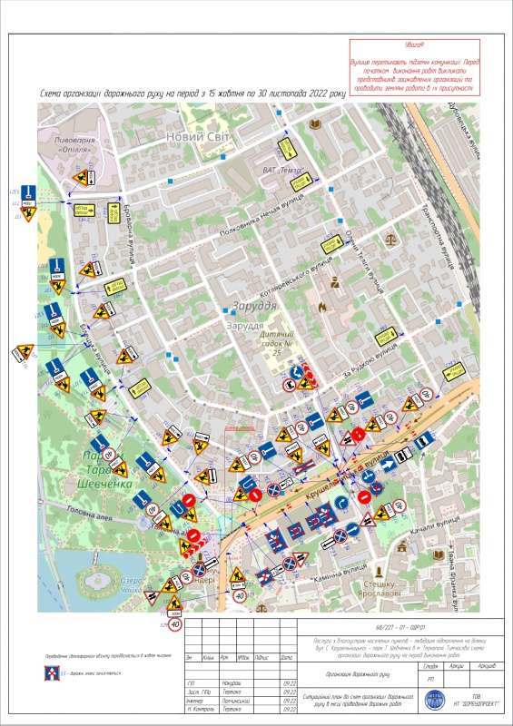 На ділянці проведення ремонтних робіт будуть встановлені дорожні знаки відповідно до схеми організації дорожнього руху.