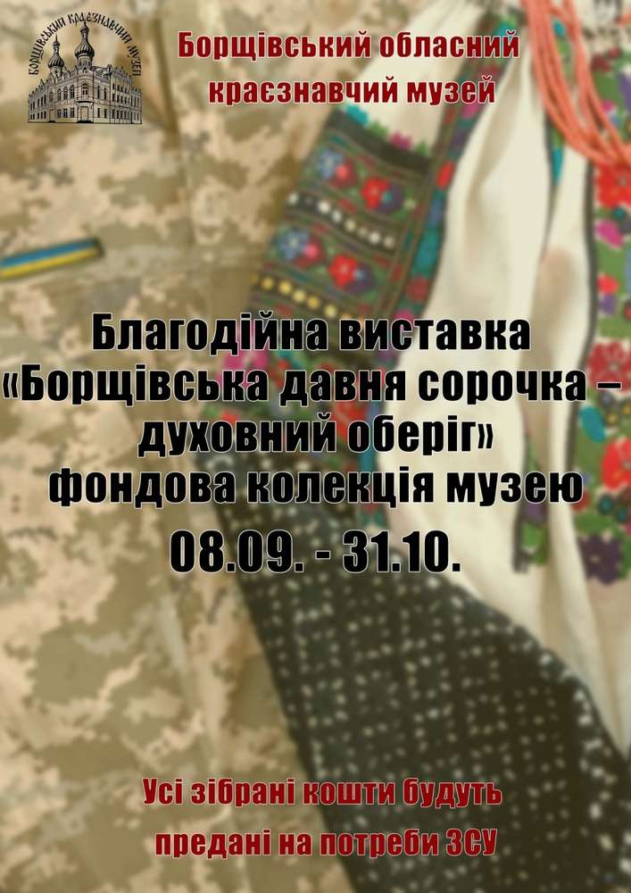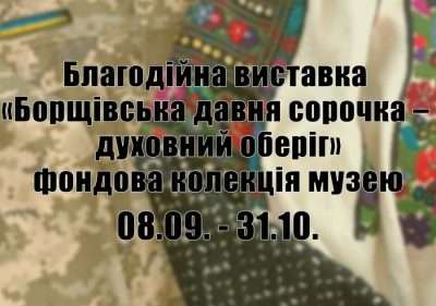 – На прохання відвідувачів у Борщівському обласному краєзнавчому музеї ще до кінця місяця діятиме благодійна виставка «Борщівська сорочка – духовний оберіг». Усі, хто закоханий у борщівську вишиванку та не встиг побачити з тих чи інших причин музейні раритети, можуть скористатися нагодою та завітати у музей. Також, продовжено збір благодійних коштів, які будуть передані на потреби української армії, – кажуть у музеї.