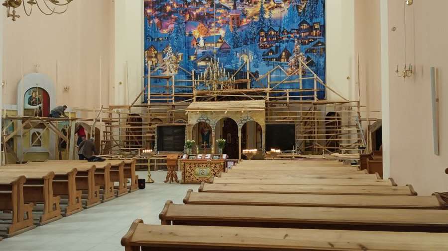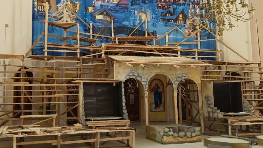 Найбільшу в Україні Різдвяну шопку розпочали встановлювати в церкві апостола Петра в Тернополі. Цього року додадуть нові елементи, які нагадують про війну в Україні. Деревину для неї облали спеціально таку, щоб змогла витримати елементи шопки.