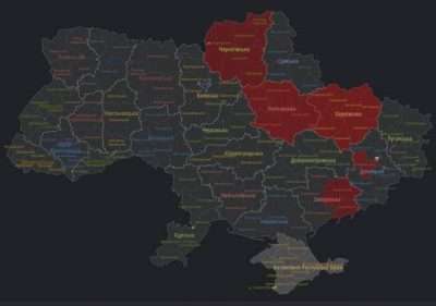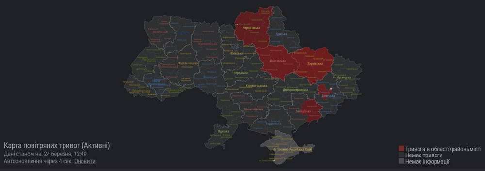 На іншій онлайн-мапі – інформація про повітряну тривогу в окремих районах України. Червоним кольором позначена тривога, білим – відсутність тривоги, а сірим – немає інформації. Дані оновлюються кожні 25