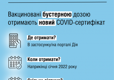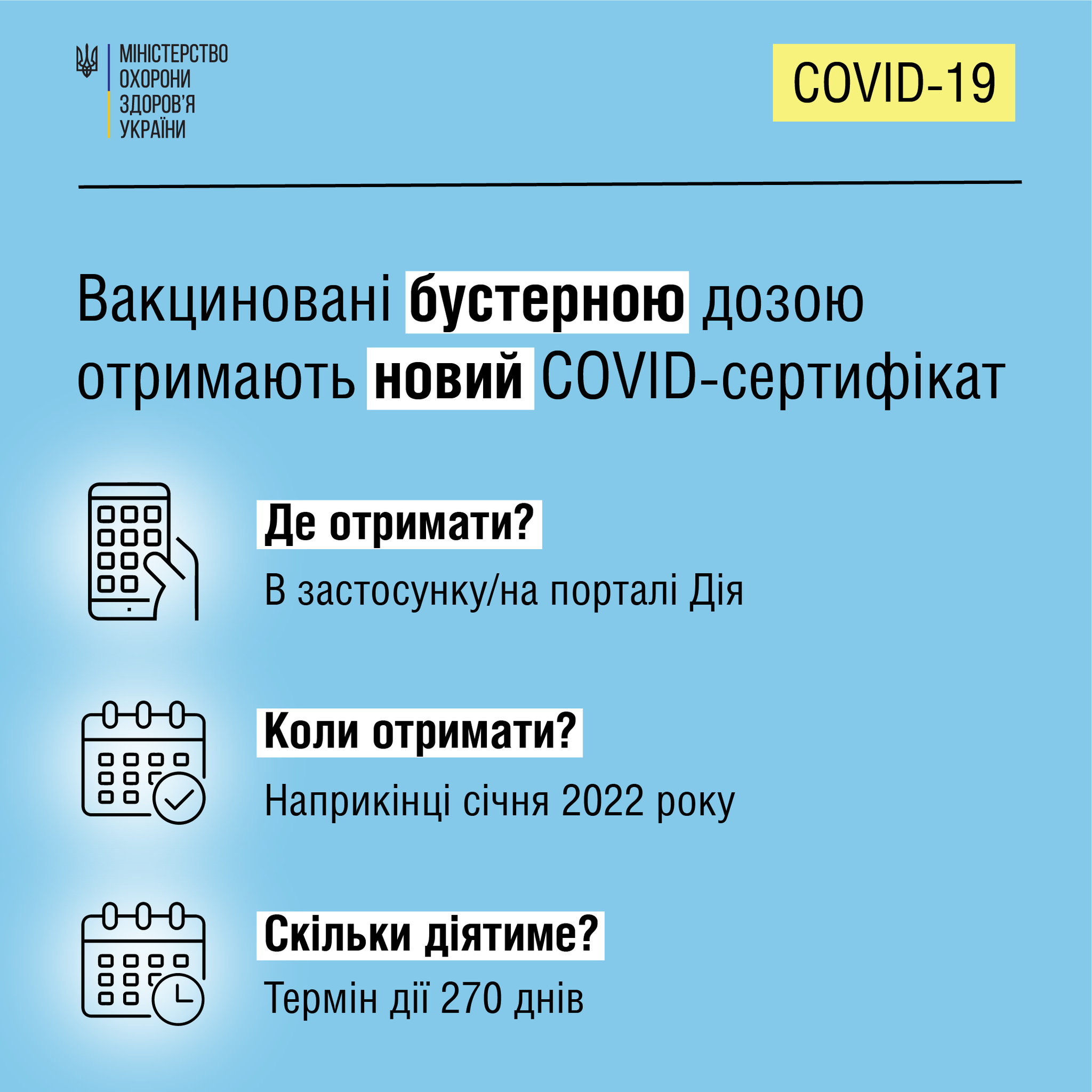 Слід зауважити, що, крім COVID-сертифіката, українці, які отримали бустер, зможуть отримати Міжнародне свідоцтво про вакцинацію. Медичний документ видається за місцем щеплення чи у сімейного лікаря та у ньому мають бути перелічені усі дози вакцинації проти COVID-19 відповідно до вимог. Цей документ, як і COVID-сертифікат, буде чинним 270 днів, рахуючи від дати останнього щеплення проти COVID-19.