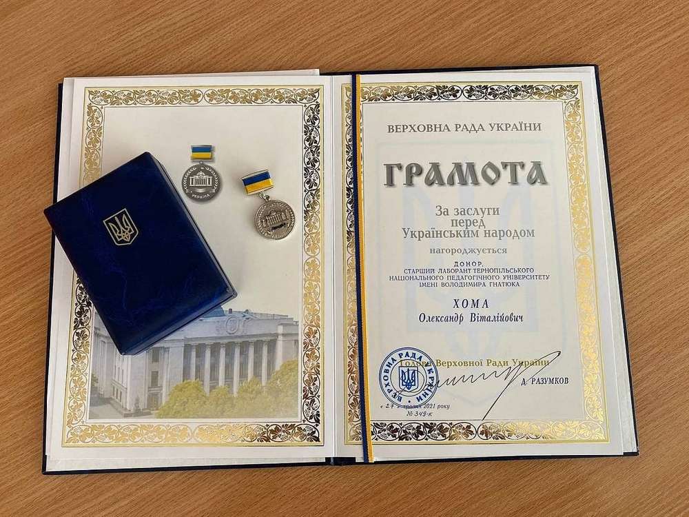 Донора та відомого громадського активіста з Тернопільщини Олександра Хому нагороджено Грамотою та відзнакою Верховної Ради України “За заслуги перед Українським народом”.