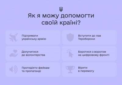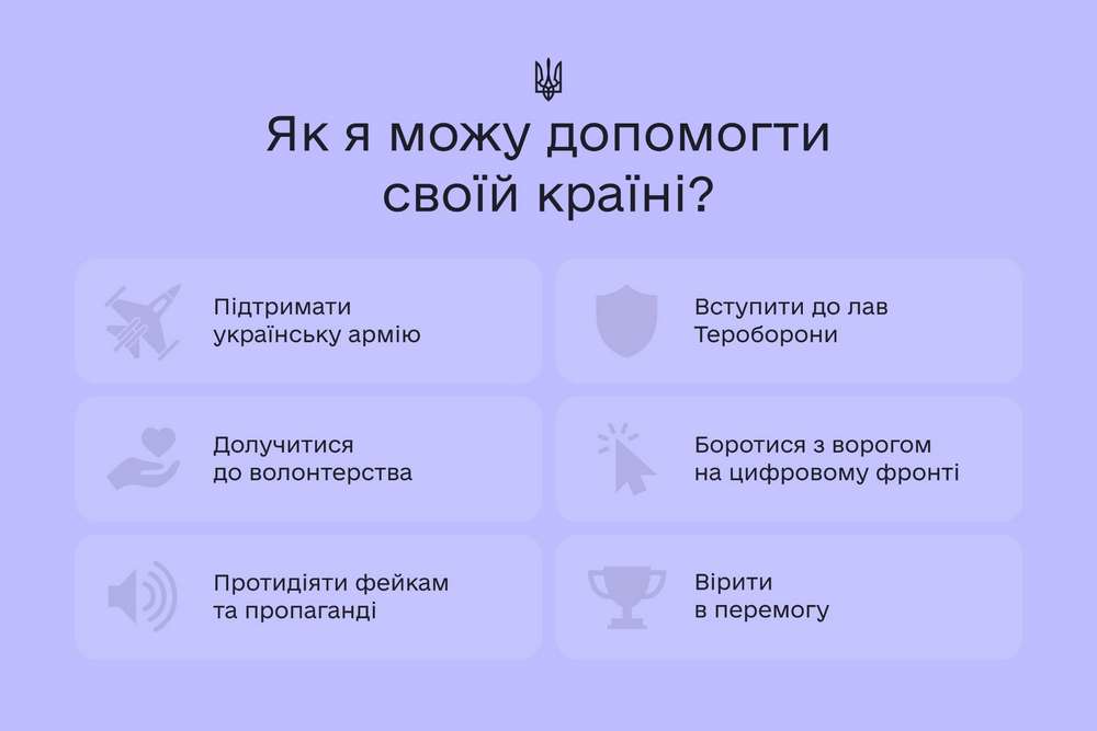 4️. Боротися з ворогом на цифровому фронті. Озброюйтеся комп’ютером чи смартфоном та долучайтеся до ІТ-Армії чи Інтернет-Військ. Також повідомляйте ЗСУ про місцезнаходження окупантів через чатбот єВорог.