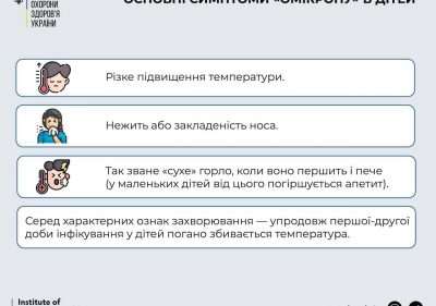 За даними Міністерства, основними симптомами “Омікрону” в дітей є різке підвищення температури, нежить або закладеність носа та пирхота в горлі.