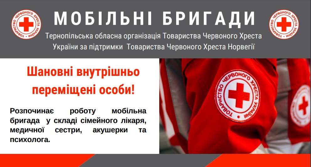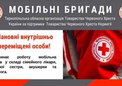 З 1 червня на базі Тернопільського міського територіального центру соціального обслуговування населення (вул. Лисенка, 8) розпочинає роботу мобільна бригада Тернопільської обласної організації Товариства Червоного Хреста України у складі сімейного лікаря, медичної сестри, акушерки та психолога, які надаватимуть необхідні послуги внутрішньо переміщеним особам. Про це повідомили на сайті міської ради.