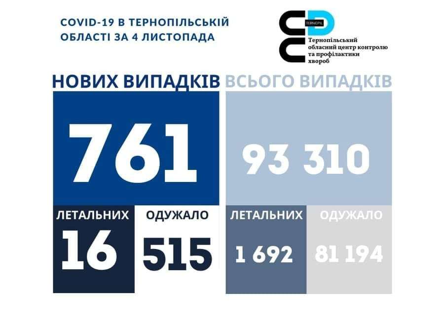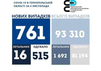 761 новий випадок коронавірусної хвороби COVID-19 зафіксовано в Тернопільській області за 4 листопада 2021 року.
