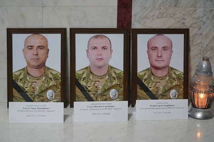 51-річний старший сержант поліції ГОГУСЬ ТАРАС ЗЕНОВІЙОВИЧ, поліцейський взводу №1 РПСПОП «Тернопіль», ГУНП в Тернопільській області. У Тараса залишилася дружина та син.