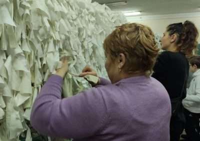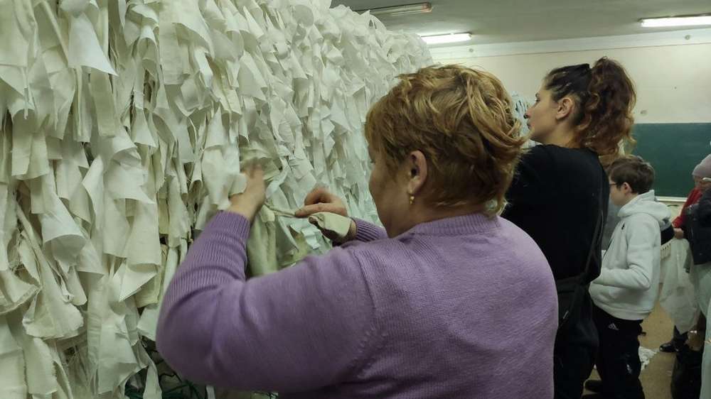 “Тканина в основному зараз потрібна біла. Але, оскільки не вистачає білої де-не-де, бачте, вкраплення чи коричневої, чи якоїсь жовтої. Воно все одно потім прикриється і буде добре”, – розповів волонтер.