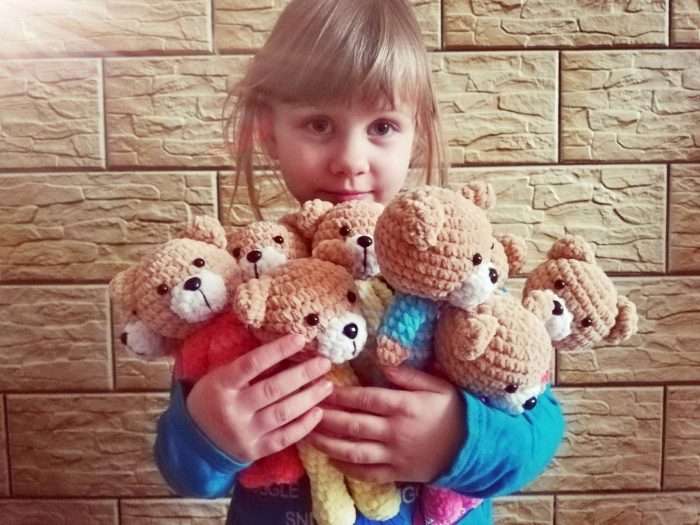 – Коли моїй донечці Ані був рочок, то хотілося щось робити, чимось зайнятися, поєднуючи день з вихованням дитини, тоді і спробувала в’язати іграшки, – каже мама Віта. – А почала захоплюватися цим мистецтвом тому, що одна знайома в’язала їх, і мені дуже захотілося спробувати. Хоча й уявлення не мала, як це робити. Для початку купила нитки 7 кольорів, тобто, основні. Придивилася, який підійде гачок, тоді це був №3. Спершу замовила бавовну, почала в’язати, але зрозуміла, що не підходять такі нитки. Тоді купила інші, акрилові, ними було краще працювати.