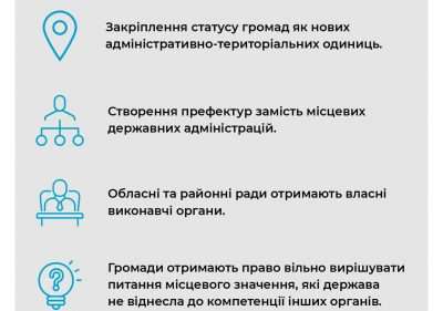 «Серед основних новацій — затвердження громад як нових адміністративно-територіальних одиниць та створення префектур замість місцевих держадміністрацій. Повноваження префекта будуть збалансовані, він не матиме права зупиняти акти місцевого самоврядування без рішення суду, буде державним службовцем і призначатиметься на посаду на 3 роки на конкурсних засадах», — підкреслив Олексій Чернишов