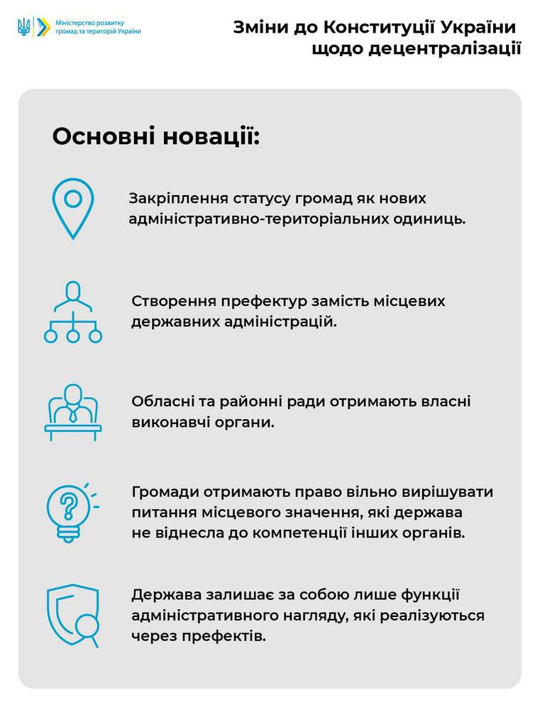 Також Міністр додав, що обласні та районні ради отримують власні виконавчі органи. Водночас держава залишає за собою функції адміністративного нагляду, які реалізуються через префектів.